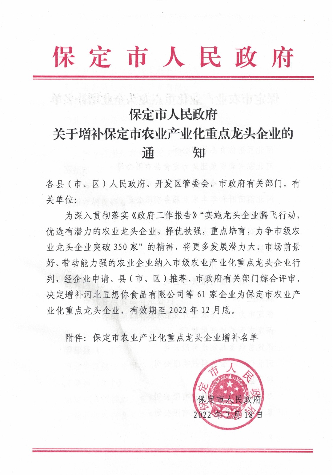 為深入推進農業供給側結構性改革,完善全市現代農業產業體系,打造一批產業鏈條長、帶動能力強、行業水平高的大型龍頭企業,近日經企業申請、縣(市、區)推薦、市政府有關部門綜合評審,2022年7月18日,保定豐饒農業科技股份有限公司認定為“保定市農業產業化龍頭企業”稱號